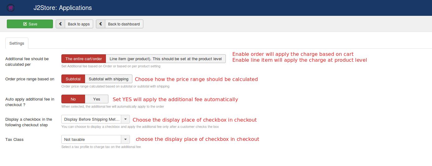Line item: This will apply the additional charge based on the product. You can set additional fee to the product individually in the apps tab on j2store cart. Once you enabled Line item, the amount / charge will be applied to the individual products.