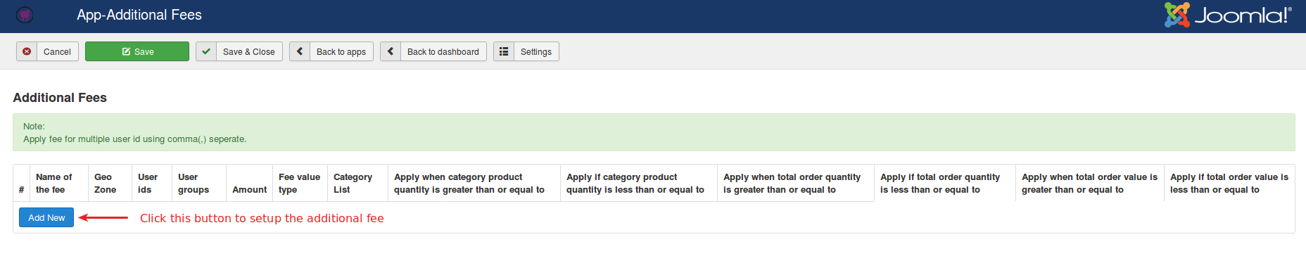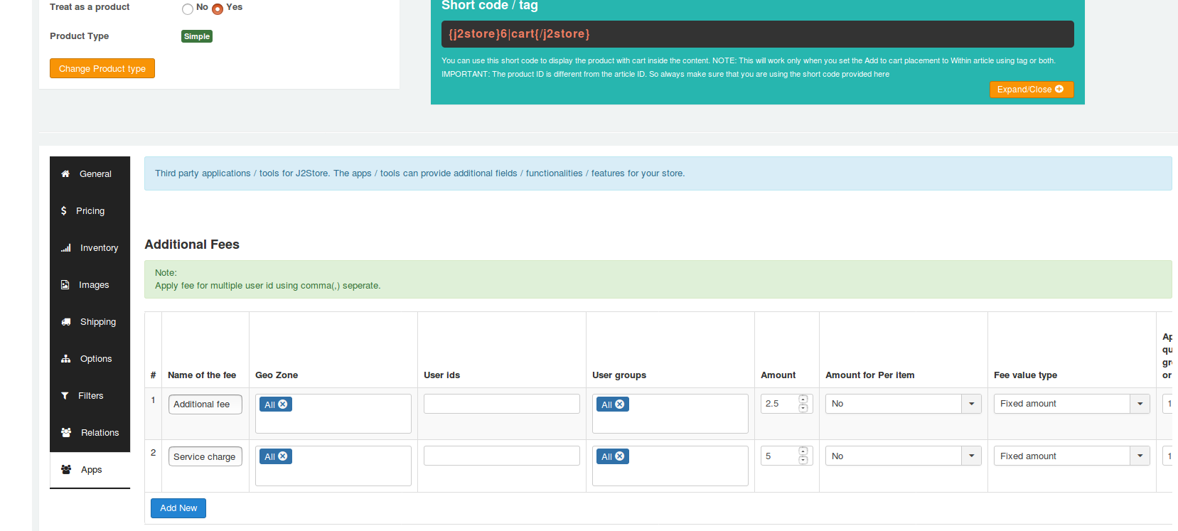 Navigate to the Apps tab and click add new button to setup the additional fee for that product. Refer the below screenshot.