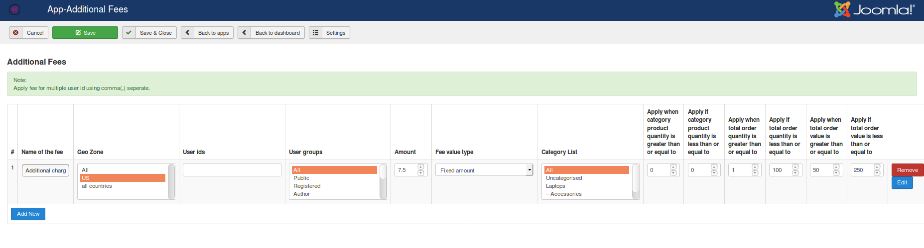 User groups: It is also possible to restrict additional fee by user group. The additional fee will be applicable to the customers belongs to the user group selected here.