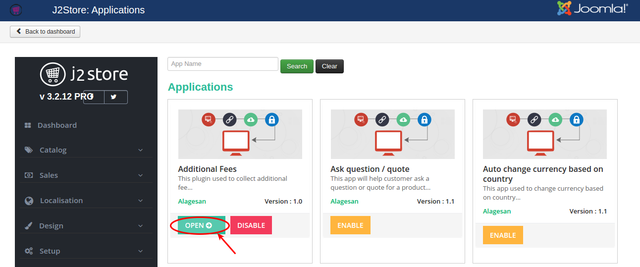 In the backend, go to J2Store Dashboard -> Apps as shown in the image below.