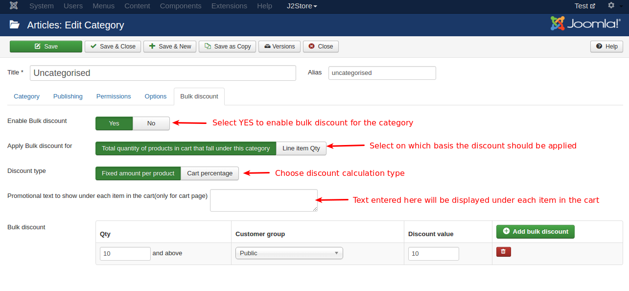 Setting up bulk discounts for particular categories: