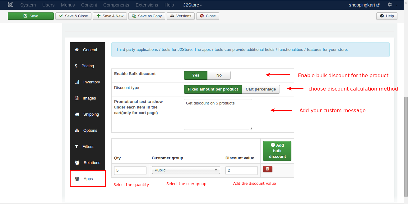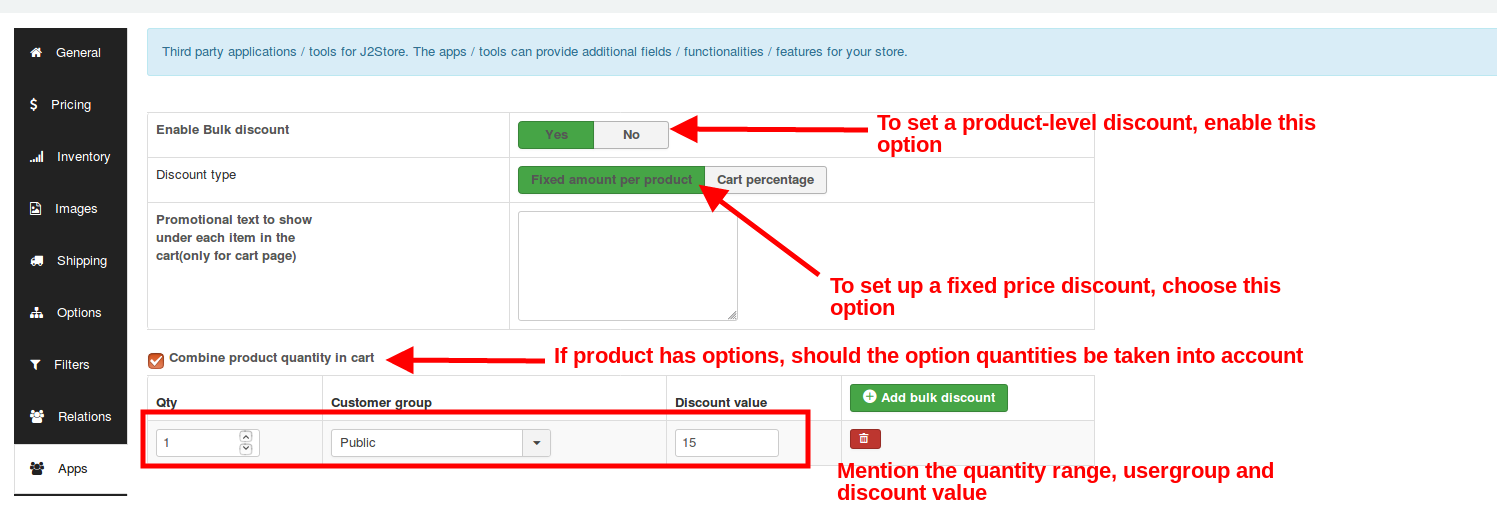 Line item Qty : This will apply the discount based on the product. You can set discount to the product individually in the apps tab on j2store cart. Once you enabled Line item Quantity, the discount will be applied to the individual products.Refer the below image for setting discount for the product individually.