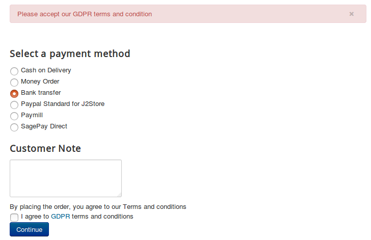 GDPR terms and conditionWhen you switch this option to Yes, the customer would see a statement on the checkout page that would request for the customer’s consent for the GDPR terms and conditions like this: