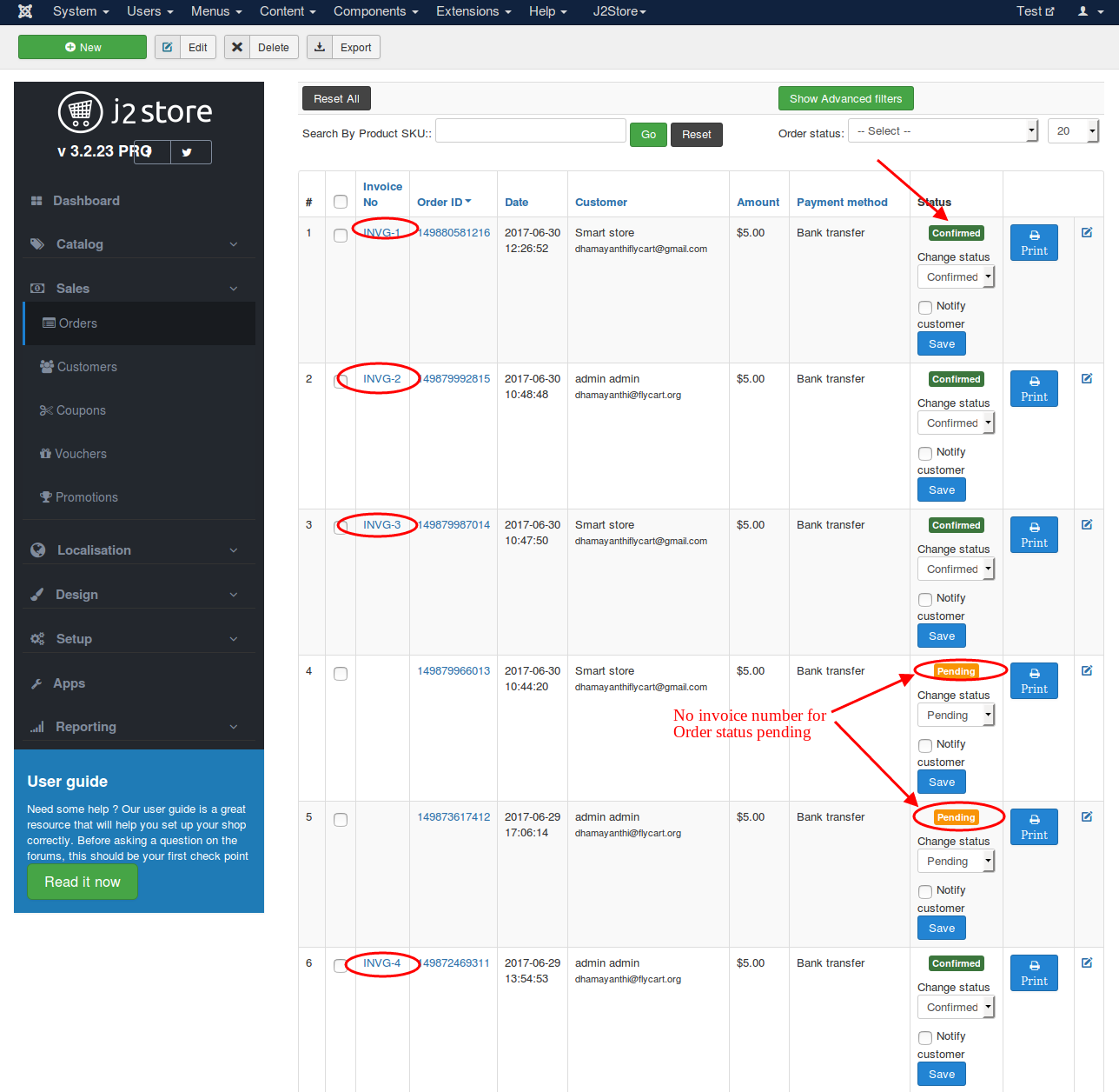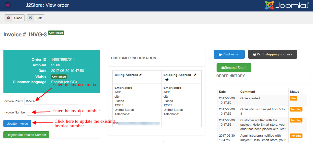 Choosing this option YES will allow store owner to edit the invoice number by going to J2Store > Sales > Orders > Edit order. For example sometimes you may need to change the invoice number for particular order status. In this case, you can use this option to edit the invoice number manually. See the image below
