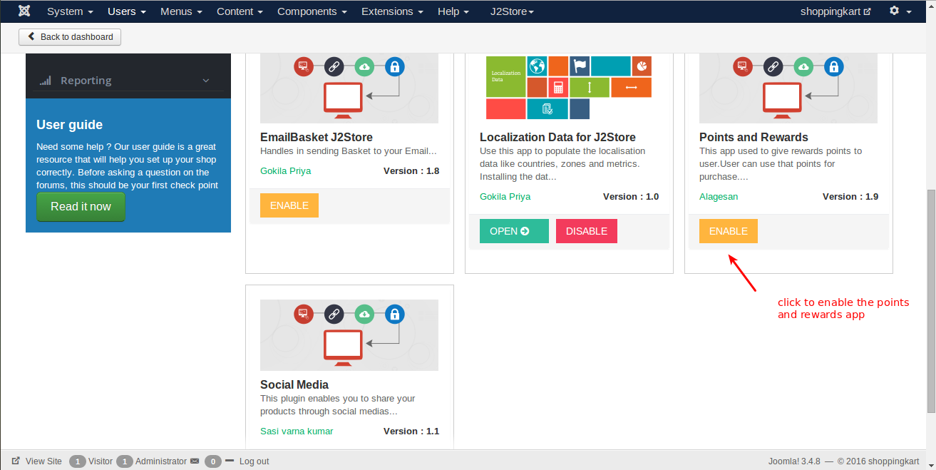 3.Click Enable in the Point and Rewards plugin. (type=j2store).