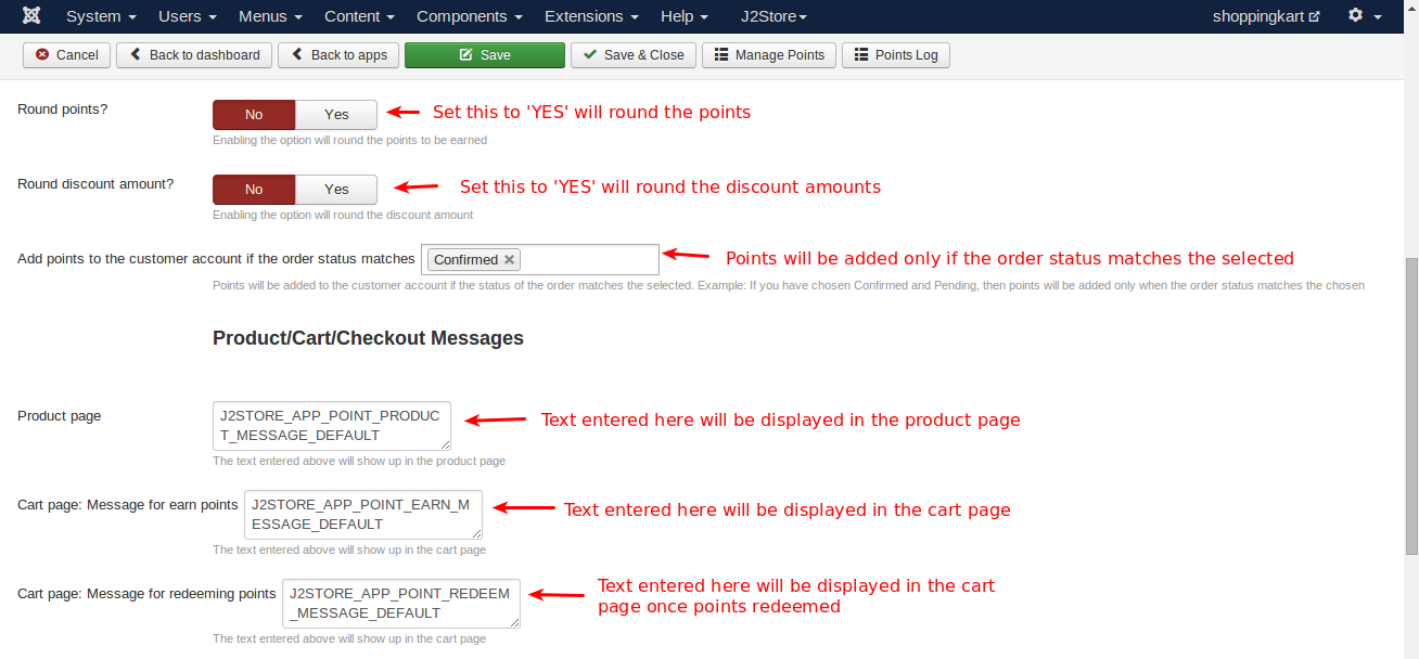 Go to J2store Product Shop, you can see the information displayed about the rewards and points.