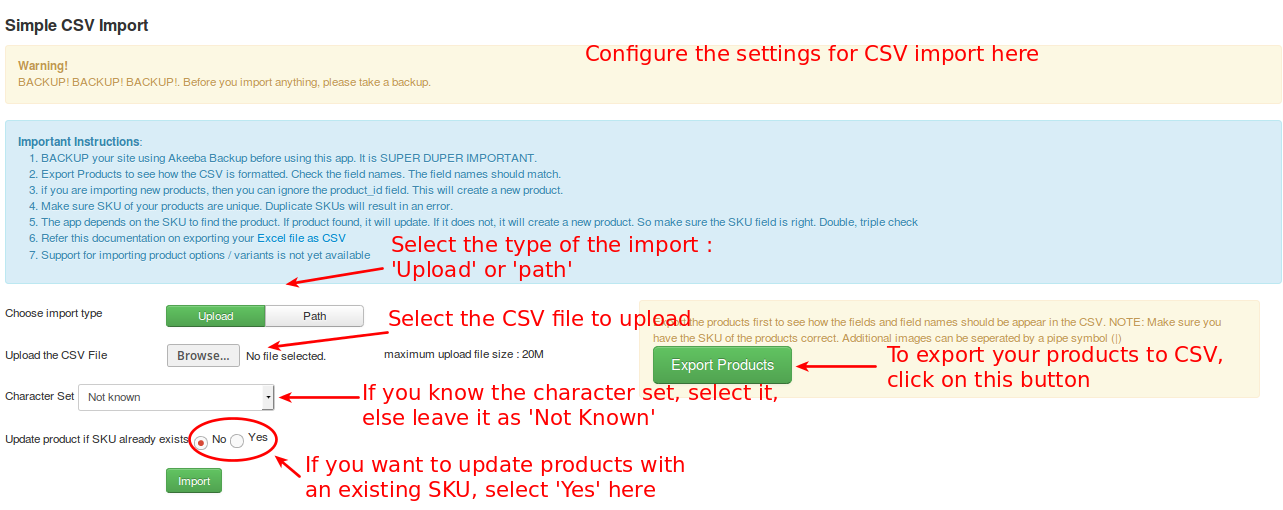 Backup your site -Before you tend to use this app for import / export operations, you MUST be careful enough to take a full backup of your site. Use Akeeba backup to take the backup.