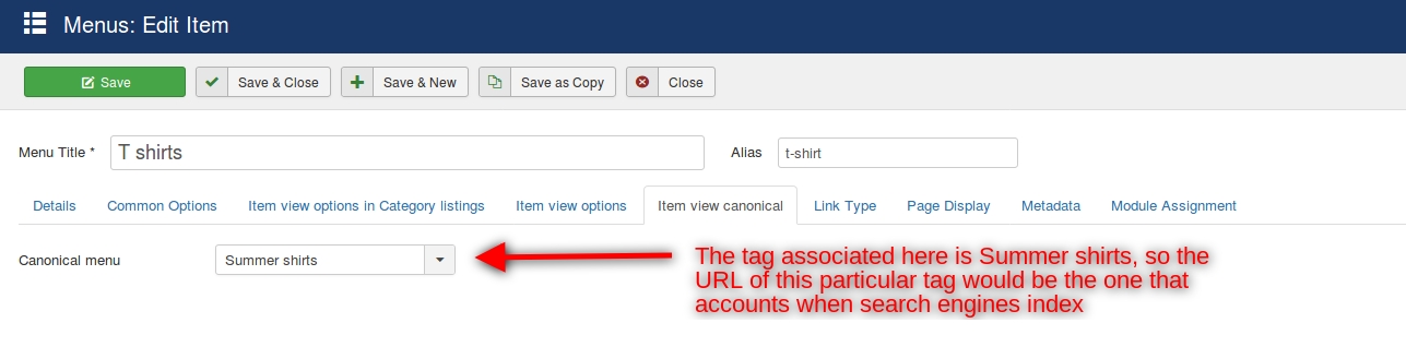 So to avoid this, the canonical URL plugin is used. When the canonical plugin is enabled and the layout is Tag view layout, the canonical menu chosen in the menu settings would be given higher priority when compared to the one set on the product level.
