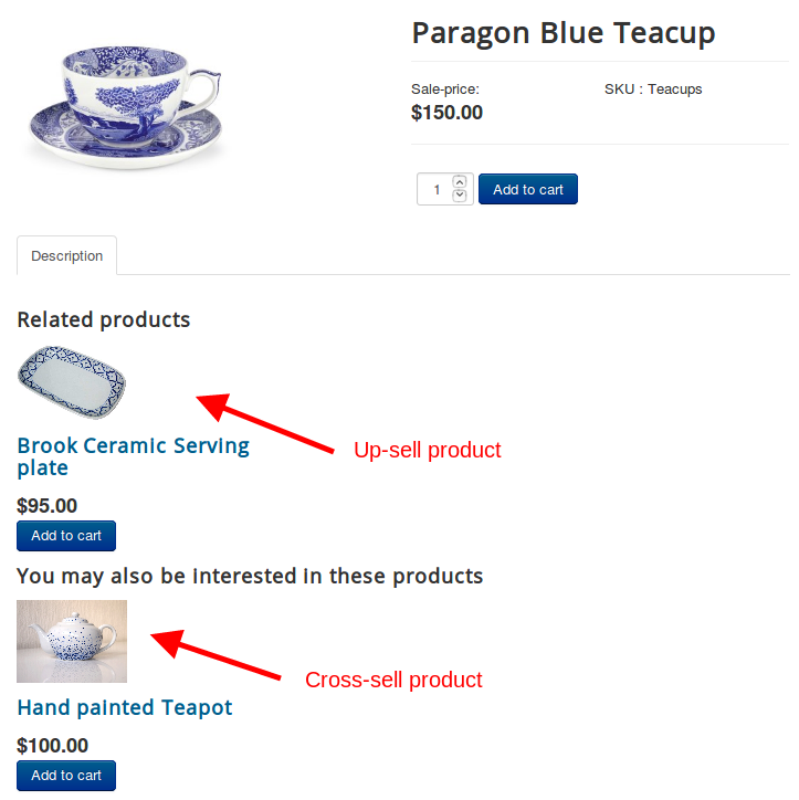 Let us suppose your site sells Tea cups, Tea pots and Serving plate. Let us suppose that the product Brook Ceramic serving plate from the serving plates section is related products to another product named Paragon Blue Tea cup from the Tea cups section and you wish to see the Hand painted Tea pot from the Tea pots menu in the cross-sells section.