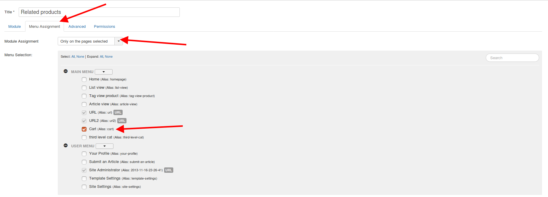 Once the layout configuration is done, now navigate to the Menu assignment tab on the module and choose the pages where the module should be published: