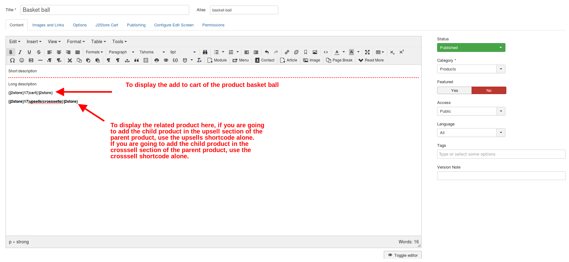 Paste it in the content part and copy the shortcode for displaying the crosssell and upsell product and paste it in the content part of the parent product. The shortcode to be copied is {j2store}17|upsells|crosssells{/j2store}