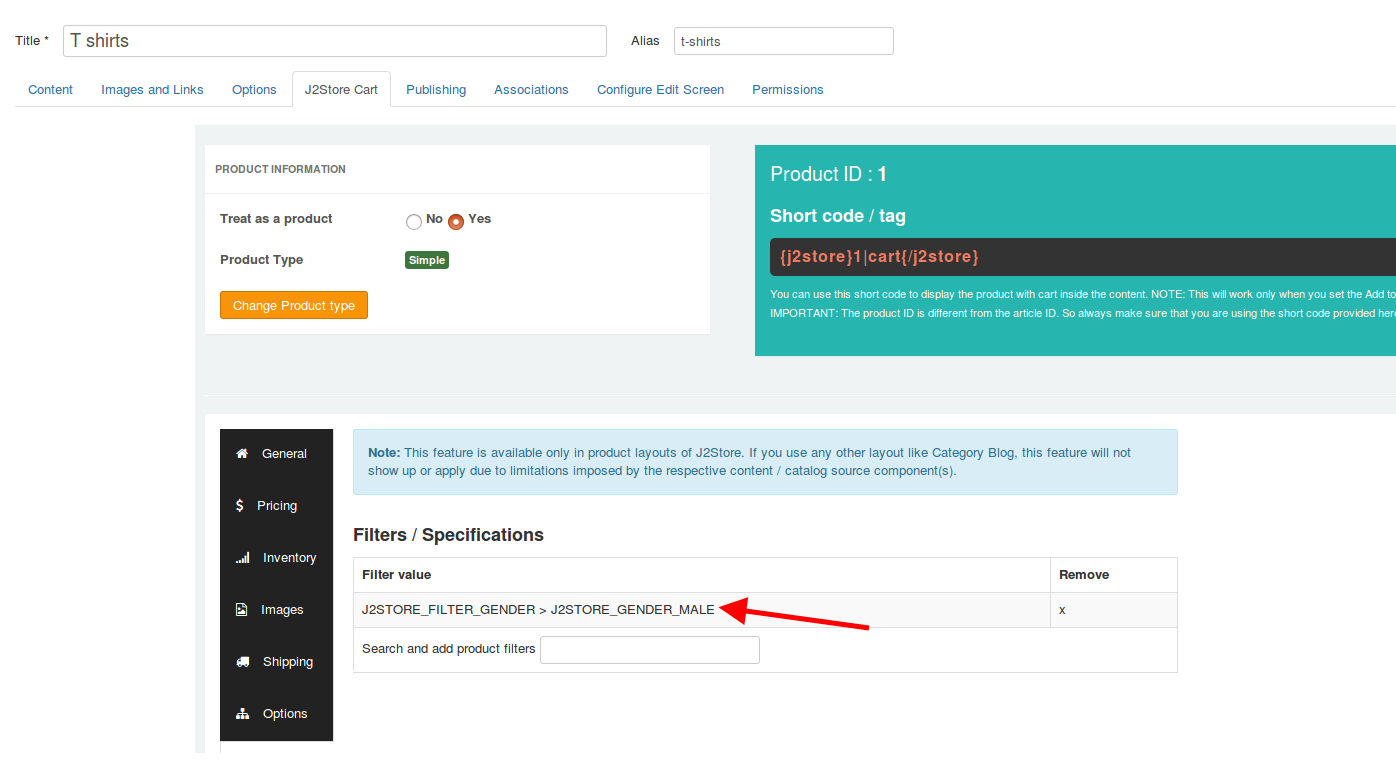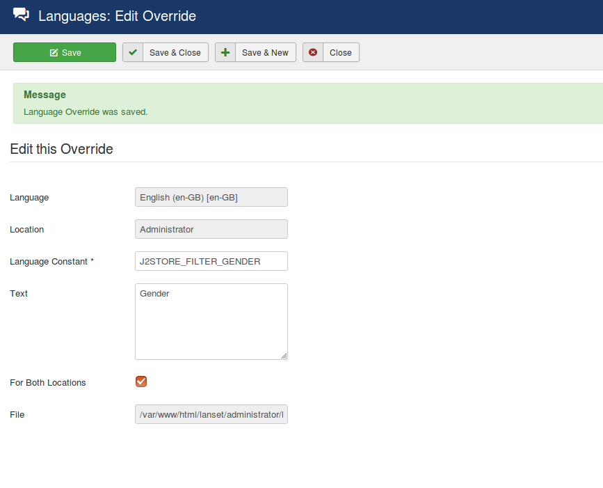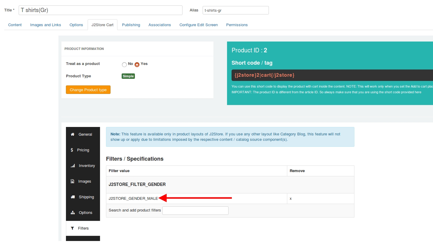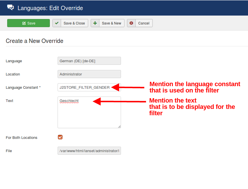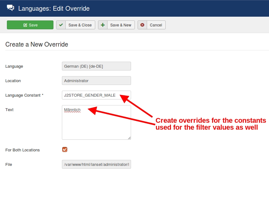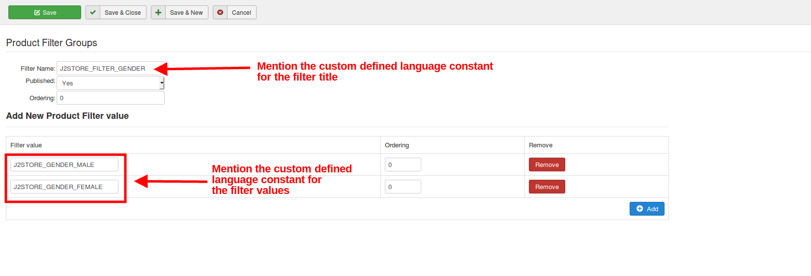 Now, replace the values of the filter with custom language constants like this: J2STORE_GENDER_MALE, J2STORE_GENDER_FEMALE