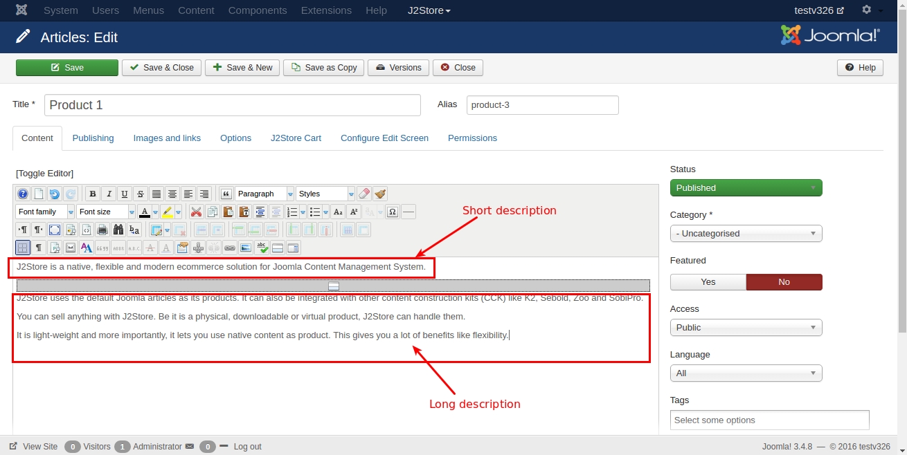 J2Store takes the introtext column as the short description and fulltext column as the long description.