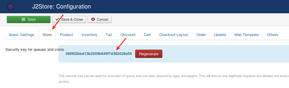 Go to J2Store > Setup > Configuration > Store tabYou can see the security key for running cron jobs. Click on Regenerate button to generate new key. Please see the below image