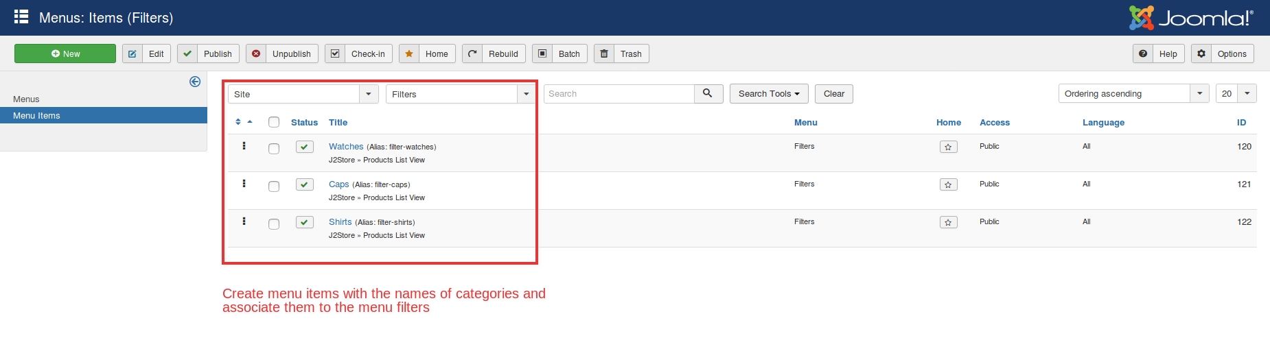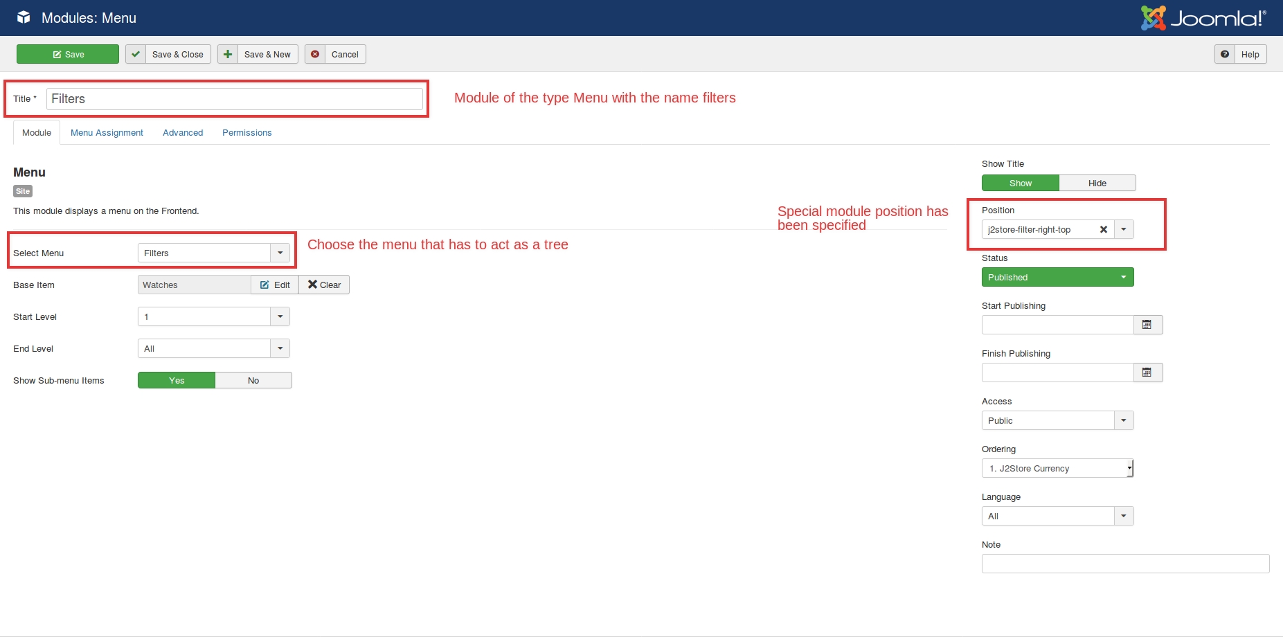 Set the position to “j2store-filter-right-top”(Please note that you have to type this fully at the position field).