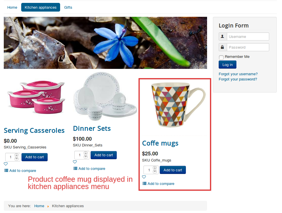 Now the product coffee mugs will be available in both Kitchen appliances and Gifts.
