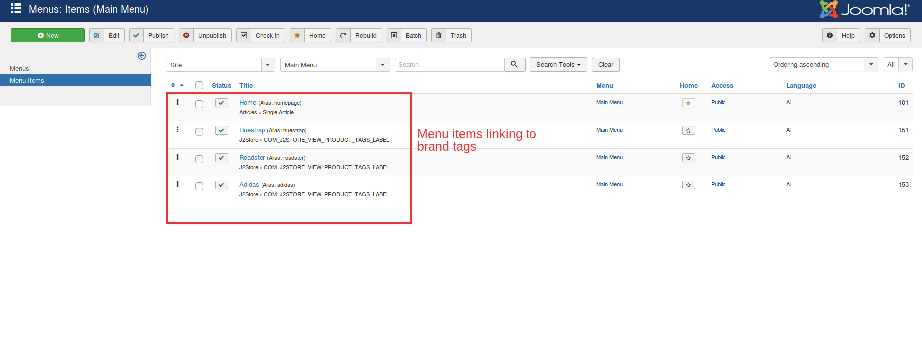 Create menus and link the tags with the respective menus.