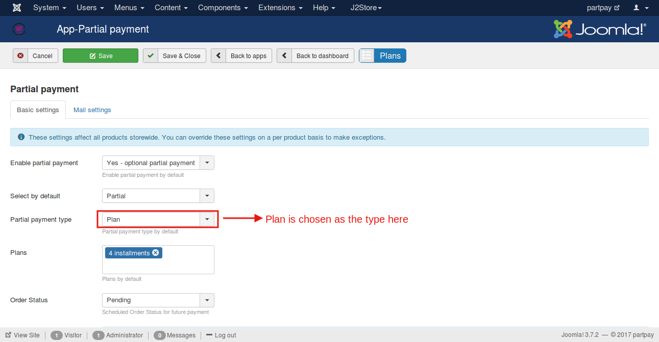 Lets suppose that you have a couch whose price is around 2000 $ and you are planning to get the payment in 4 pieces. In that case you could create a plan with the partial payment app called 4 installments as shown in the below screenshot: