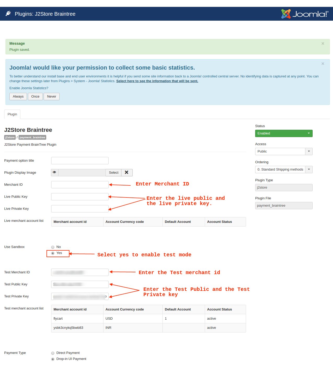 The merchant details will be displayed after entering the Test merchant key, Test public key,Test private key and clicking on save