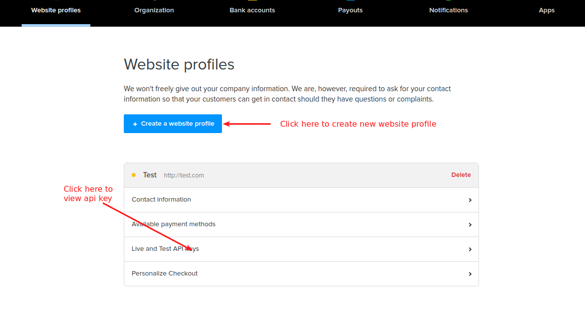 In the resulting page, you will have to look at your website profile details or to create a new website profile if you don’t have any existing web profiles. Click on Create new website profile.
