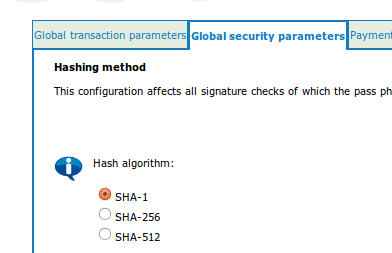 Hash Method Select Hash method (SHA-1, SHA-256, SHA-512) associated with your postfinance account. It should be set to SHA 1.
