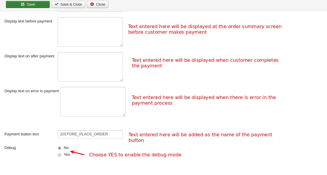 Choose YES to enable the debug mode. If you set this to yes, then debug messages will be logged and saved in the cache folder in your Joomla root directory. DO NOT select YES in the live site.