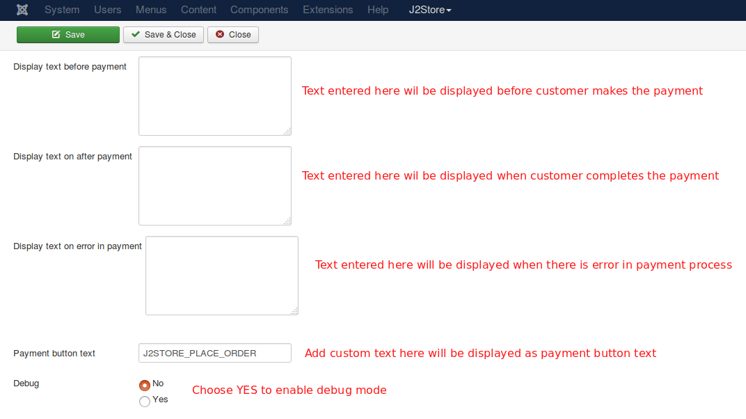 Debug Choose YES to enable the debug mode. If you set this to yes, then debug messages will be logged and saved in the cache folder in your Joomla root directory. DO NOT select YES in the live site.