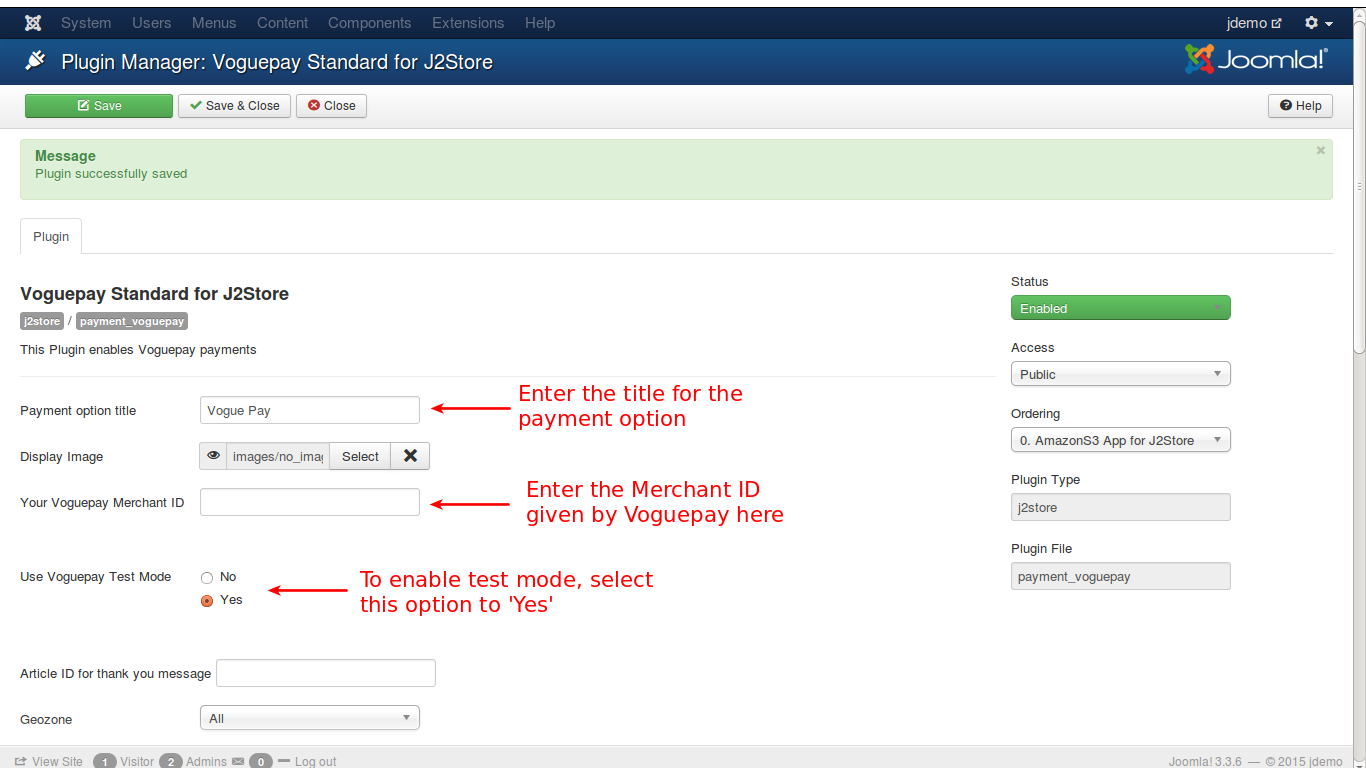In the backend, go to Extensions->Plugin Manager and open the Voguepay Payments plugin. (type=j2store).