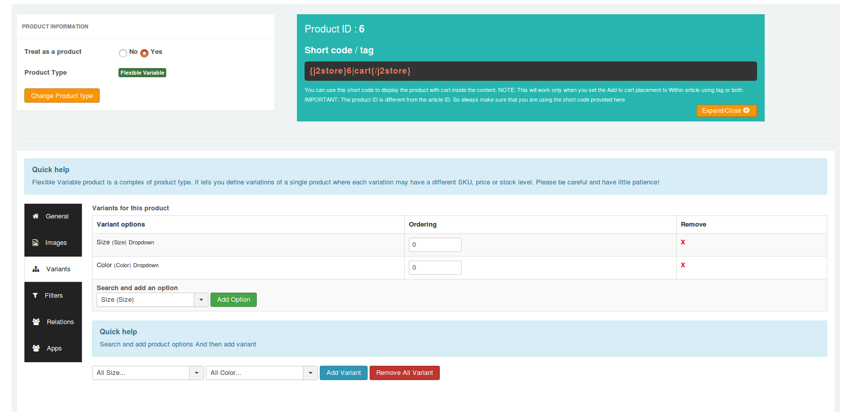 Now you will get options to add variants to the product. Choose size from the drop down “All size” and then choose the color and click on Add variant button.