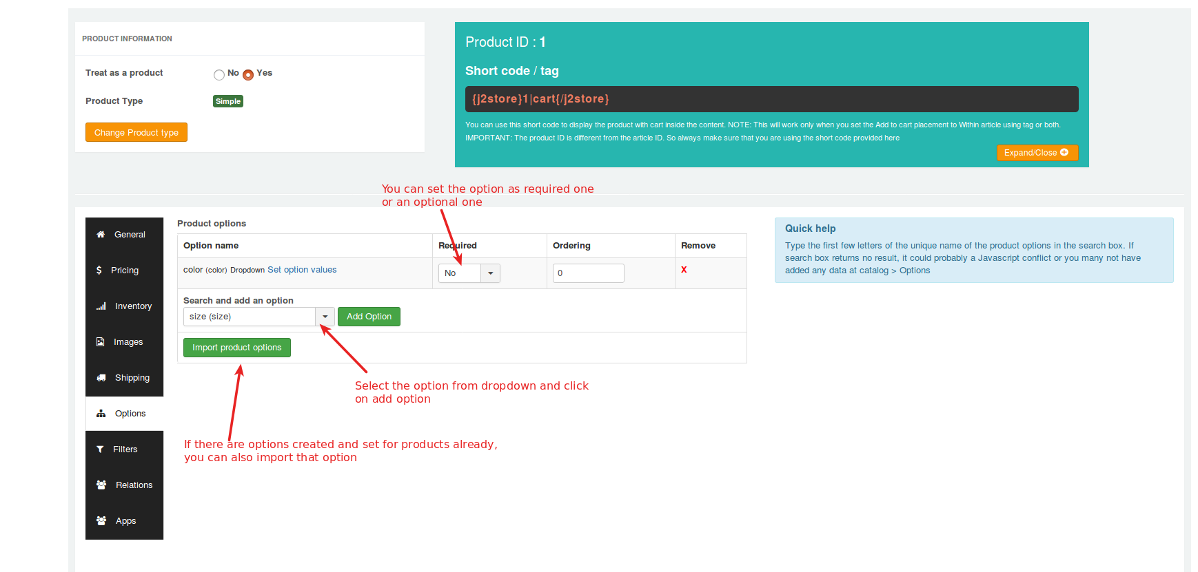 You can add options for your product, as illustrated in the image. If you have already set an option for some other product, and wish to import the same option to this product, you can do so by clicking the import product options button, which will bring out a popup window, like this.