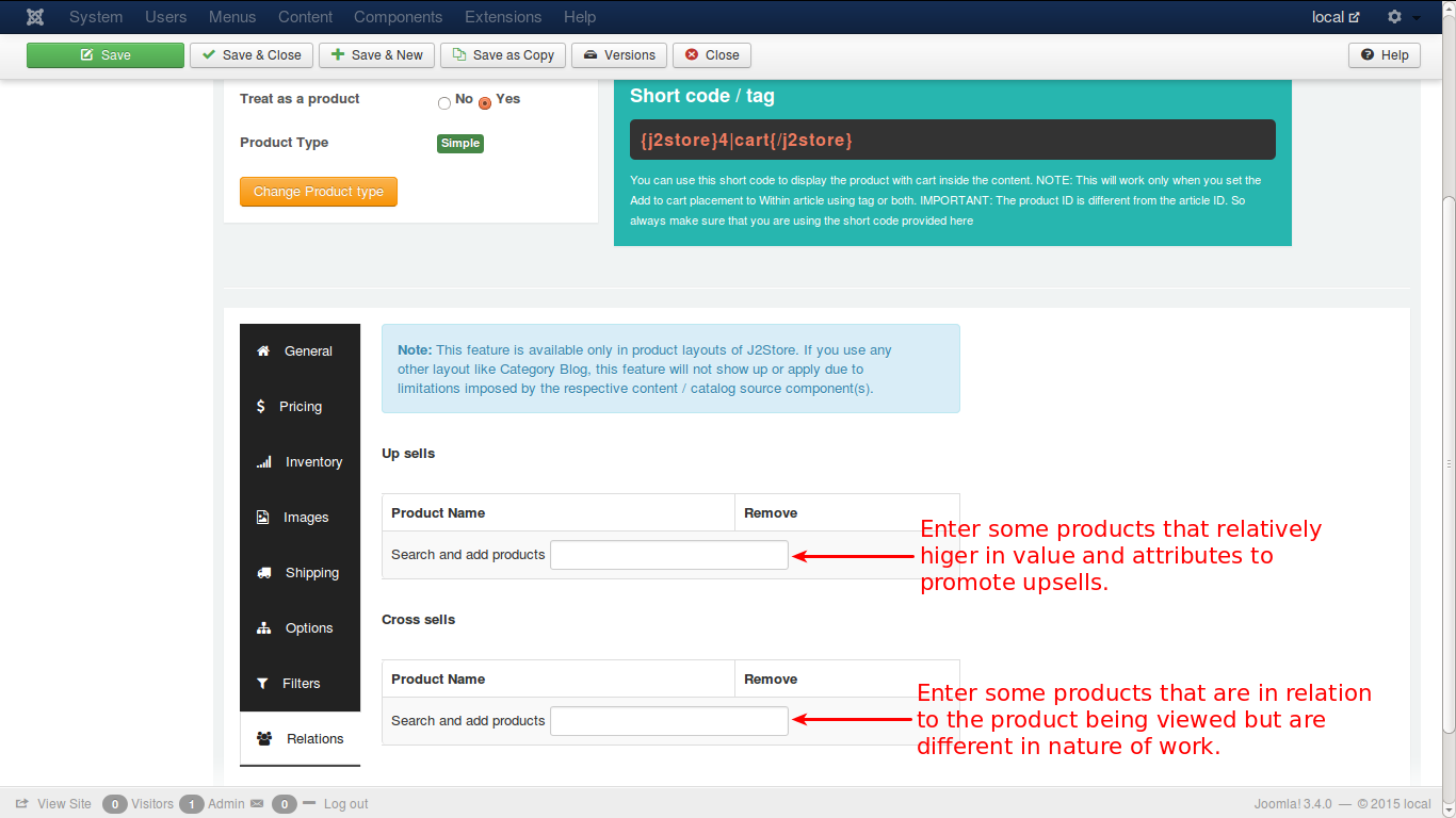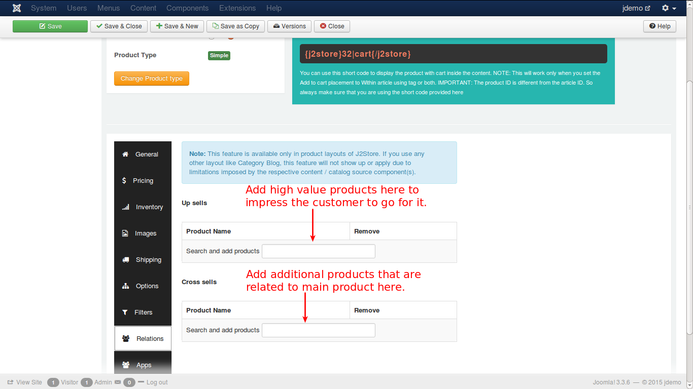 The next tab is Relations. Here, you can add products of higher value than the one being viewed by the customer and recommend the customer to buy that product, citing its advantages and additional features. This is an upsell.