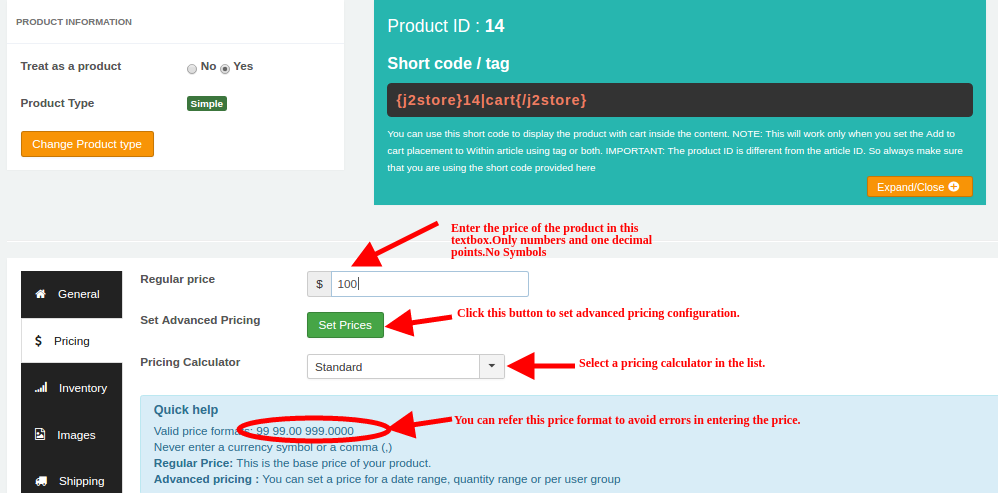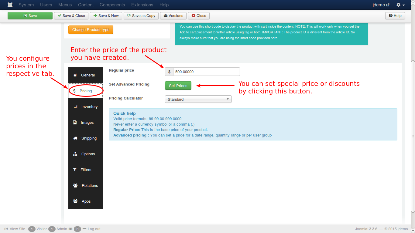 As illustrated in the image, you can set the regular price by entering the value in the text box. If you want advanced pricing, click the ’Set Prices’ button and it will open up a pop-up window to allow you to set an advanced price setting.
