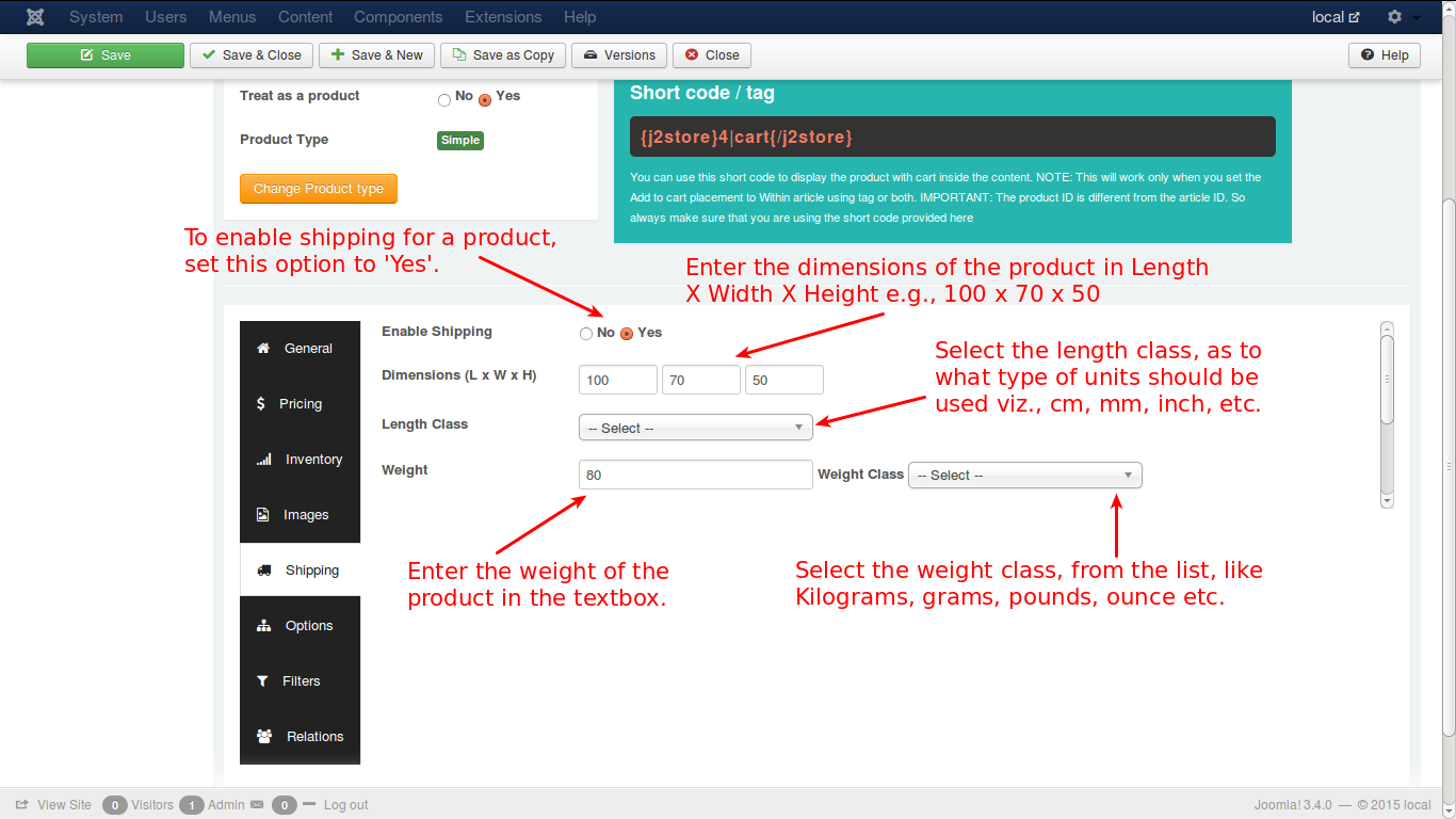 Enter the options with details according to your needs to enable shipping, the dimensions and weight of the product, classes for length and weight. Next is options.