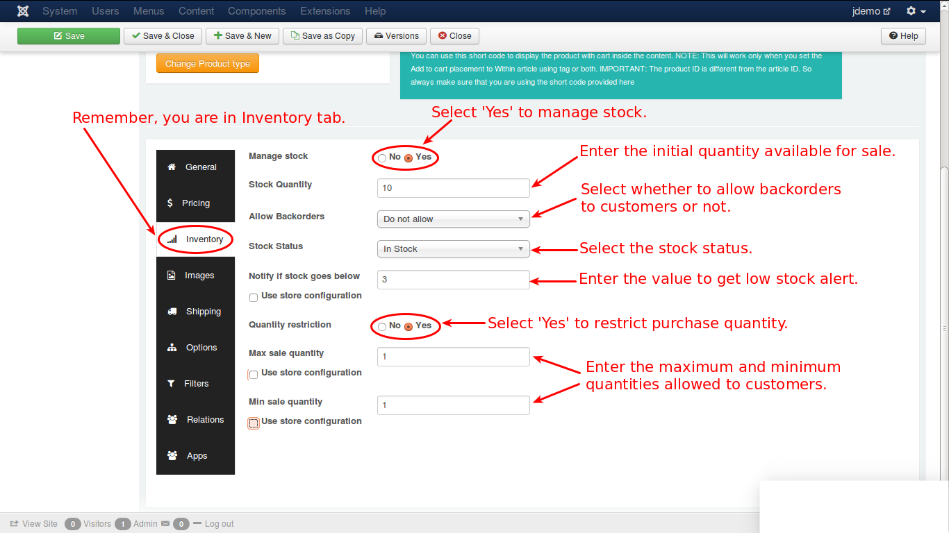 Select ‘Yes’ if you want inventory management. Enter all the fields as required. They are fairly self explanatory, still assisted in the image. And move on to images.