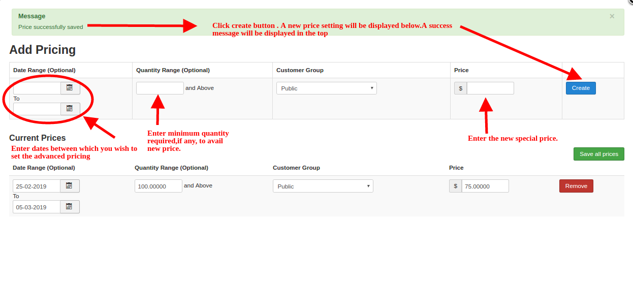 Enter the dates between which the special price is offered, the minimum quantity to avail the special price, the user group eligible, the special price and click ‘Create’. Now, the new price is listed as a row below. You can further edit and save or delete if you want. Lets move to Inventory, to understand stock management.