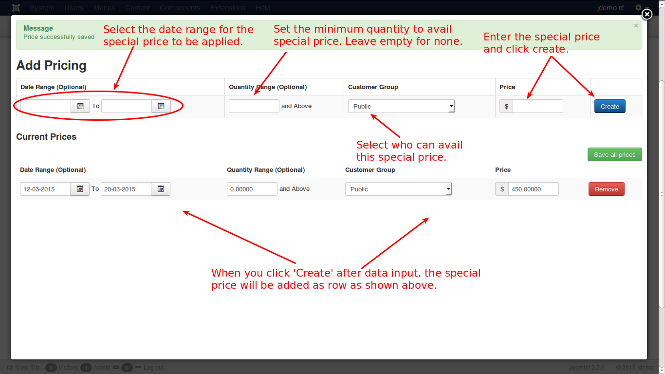 Now enter the special price and click Create.