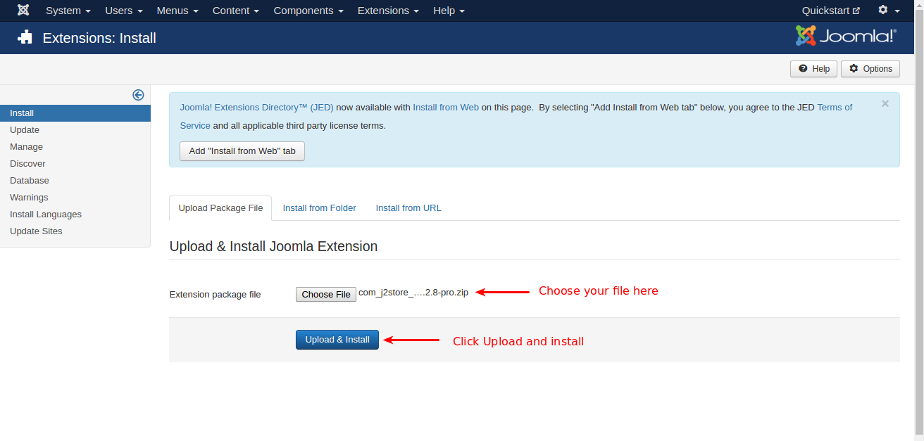 Use the Joomla installer to install the J2store package.