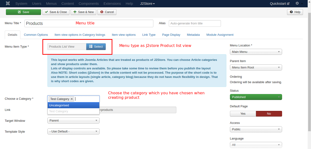 Give the menu title and choose the menu type as J2store > Product List View