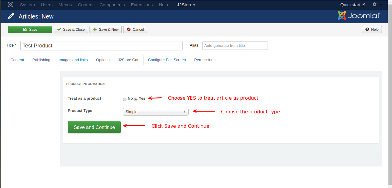 Now, go to J2store Cart tab, choose YES to Treat as a product then choose your Product Type from the list(Simple, Variable, Configurable, Downloadable) and then click Save and Continue.