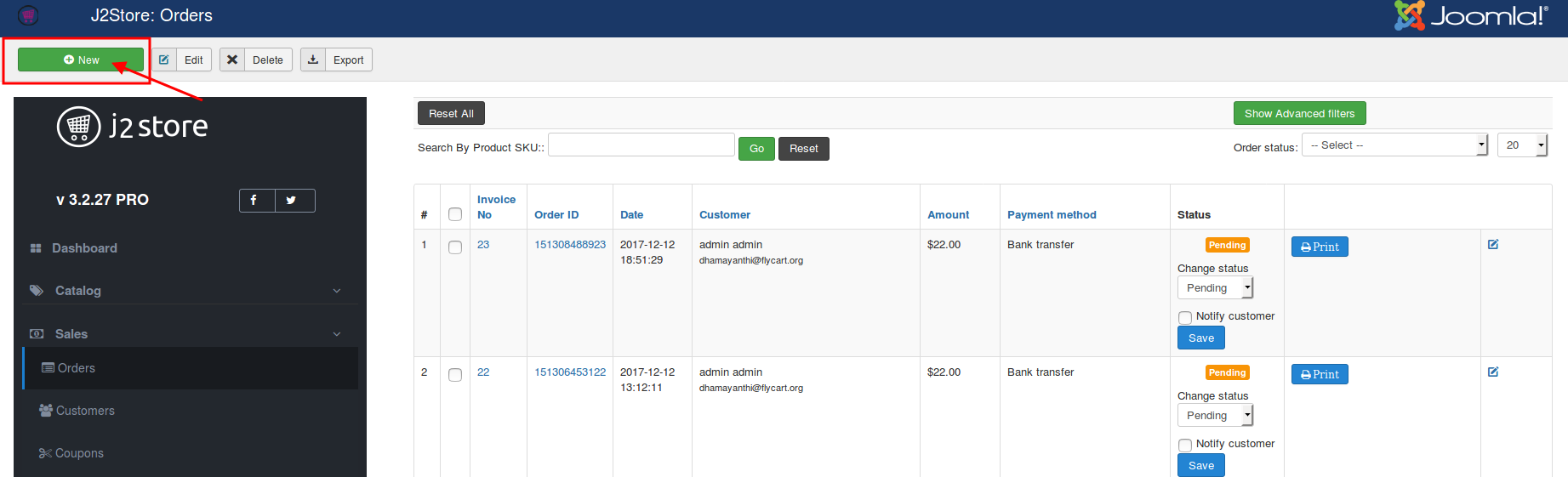 J2Store allows you to send a invoice first and then collect the payment from customer. This is possible by creating an order from backend. Follow the below steps to create an order from backend: