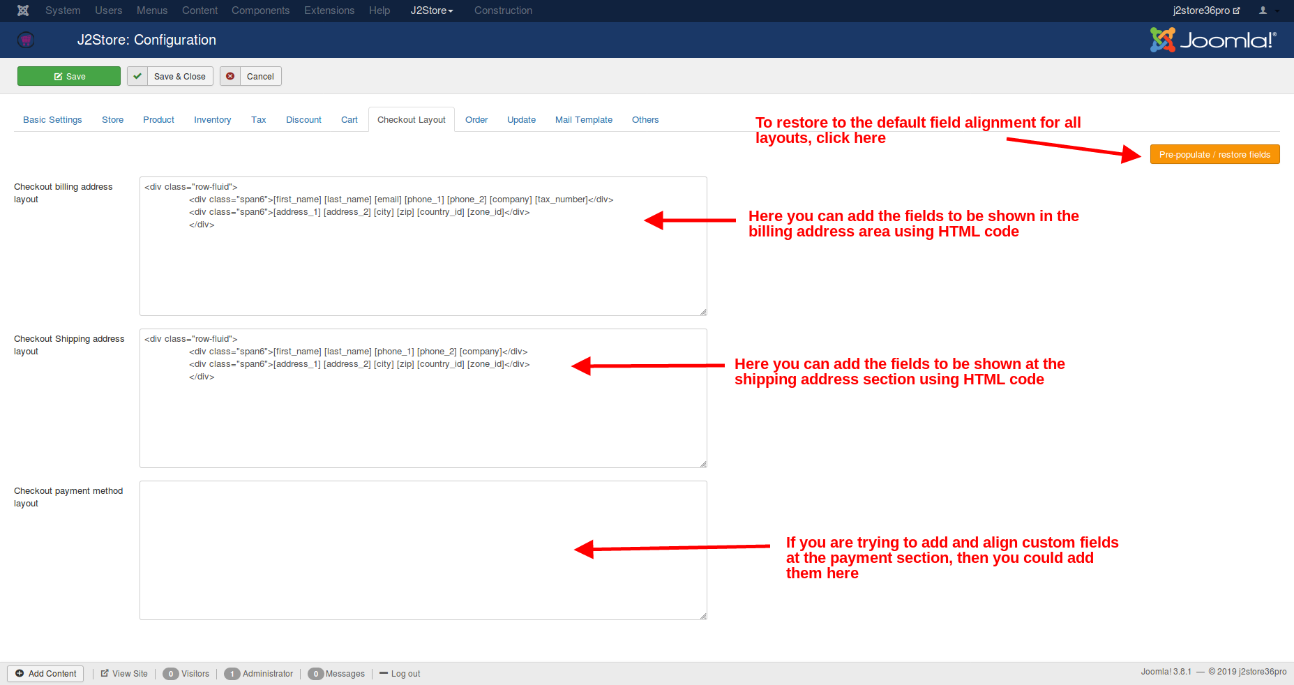 Checkout Billing Address Layout This option helps to include/exclude the required fields in the layout of Billing Address. For e.g., [first_name][last_name][phone_1][phone_2][company] [tax_number][address_1] [address_2] [city] [zip] [country_id][zone_id]Like this any html code can be added here for one’s desired layout.