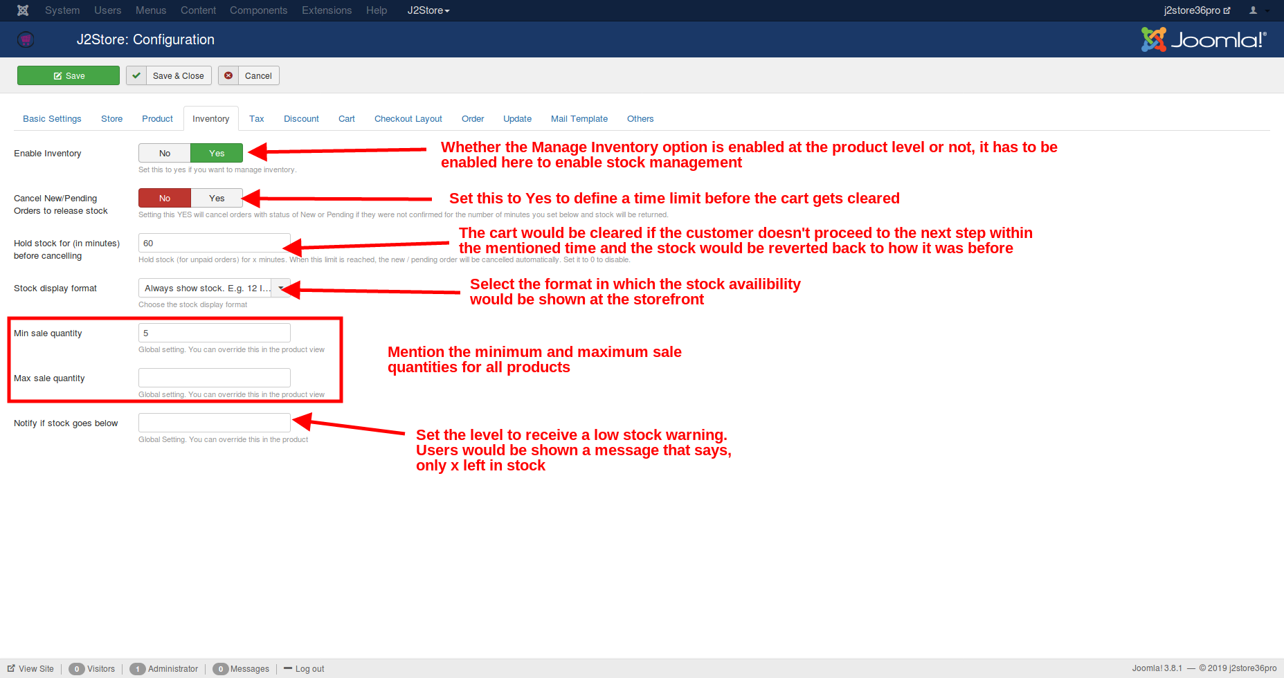 Enable Inventory Set this option to ‘Yes’ to enable inventory management. Provide the available quantity when a product is added and it will be kept in track whenever an order is processed. Upon successful completion of an order, the ordered product quantity will be deducted from the available quantity and the result will be the new available quantity and when available quantity for a particular product becomes zero, the add to cart button will be disabled. Also, the user cannot enter a quantity greater than available quantity.