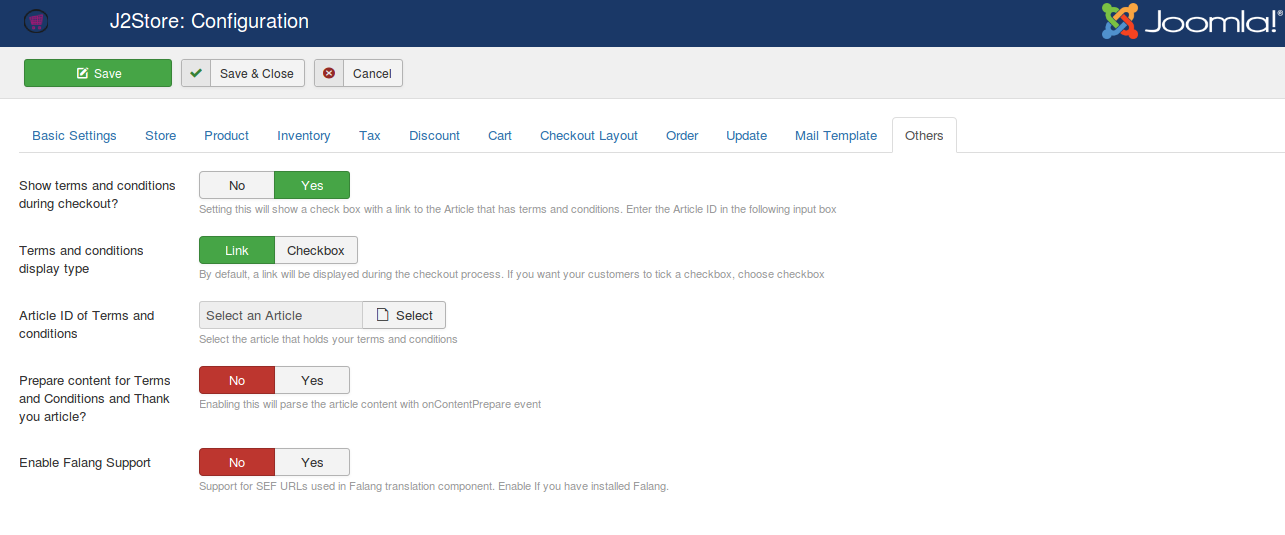 Show Terms and Conditions during Checkout If this option is set with a Yes, a checkbox with a link to the article that contains the Terms and Coditions will be shown.