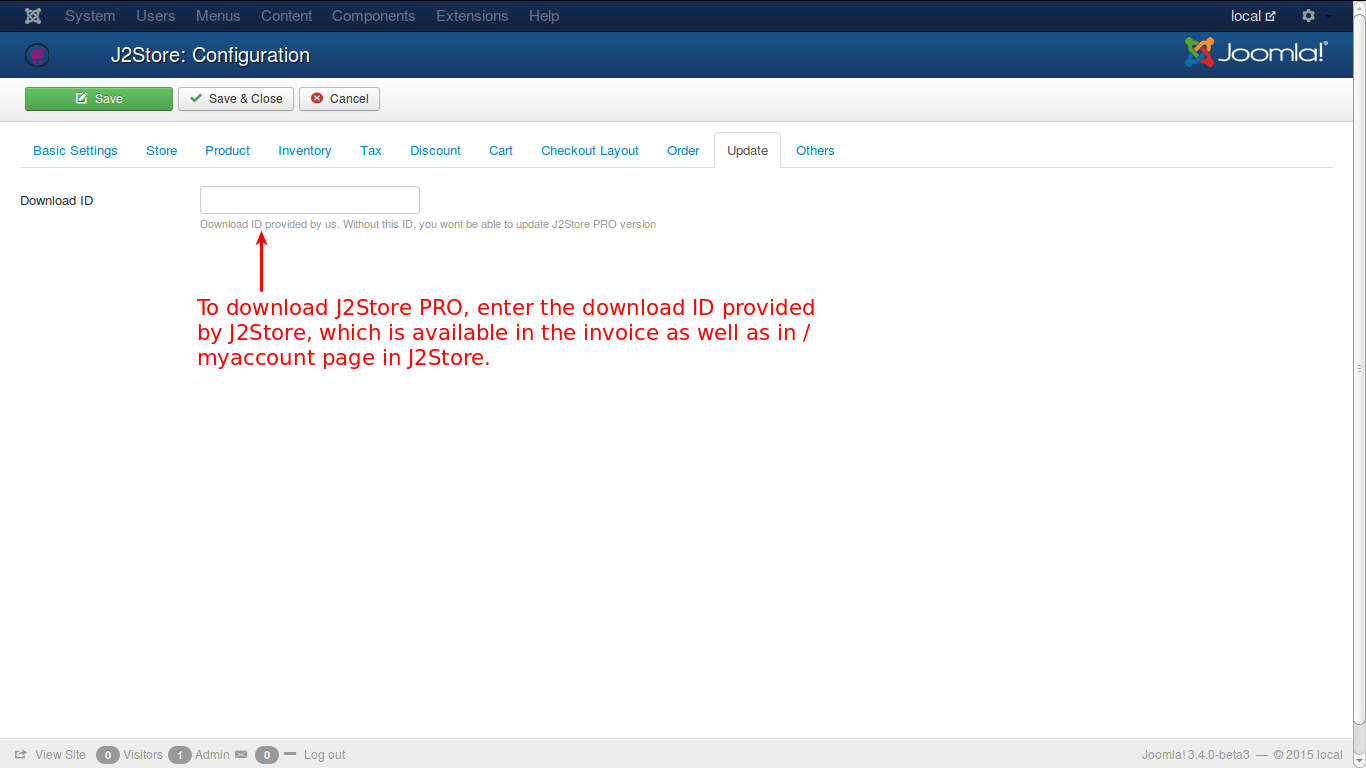 This tab has a text input to enter the Download ID provided by J2Store , which is a requirement for updating the j2store component’s PRO version. Without this ID, j2store PRO cannot be downloaded. This ID will be available in the Invoice as well as in My Download of j2store.org