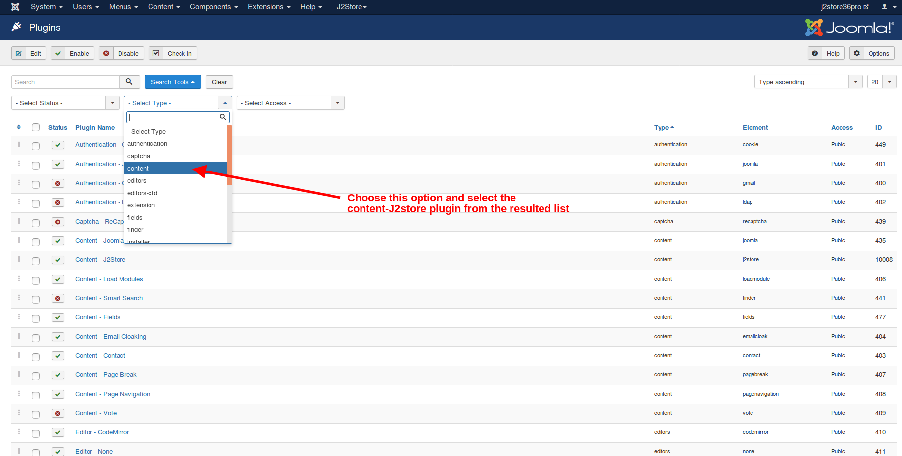 From the resulting window, select Content from the Select Type filter on the left pane and click on Content - J2Store from the list, as illustrated in the image below