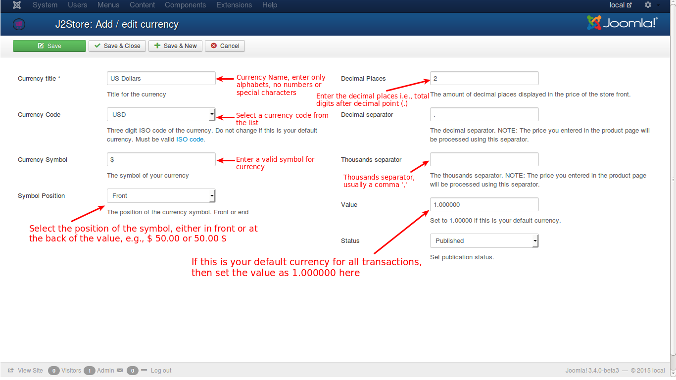 This option sets the status of publication of the currency. If it is set to be Published, then it will be available for payment process. Otherwise, it will not be available for payments.