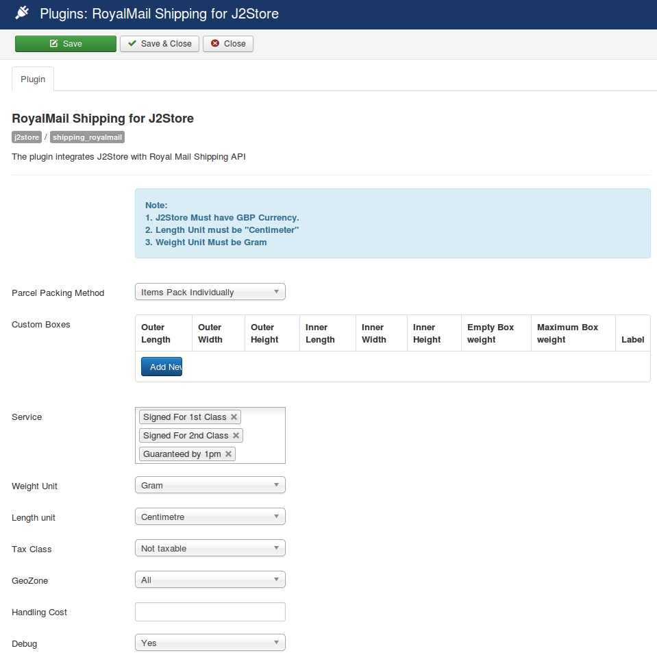 The plugin integrates J2Store with the Royal Mail Shipping Rates API to get shipping price quotes in real time.
