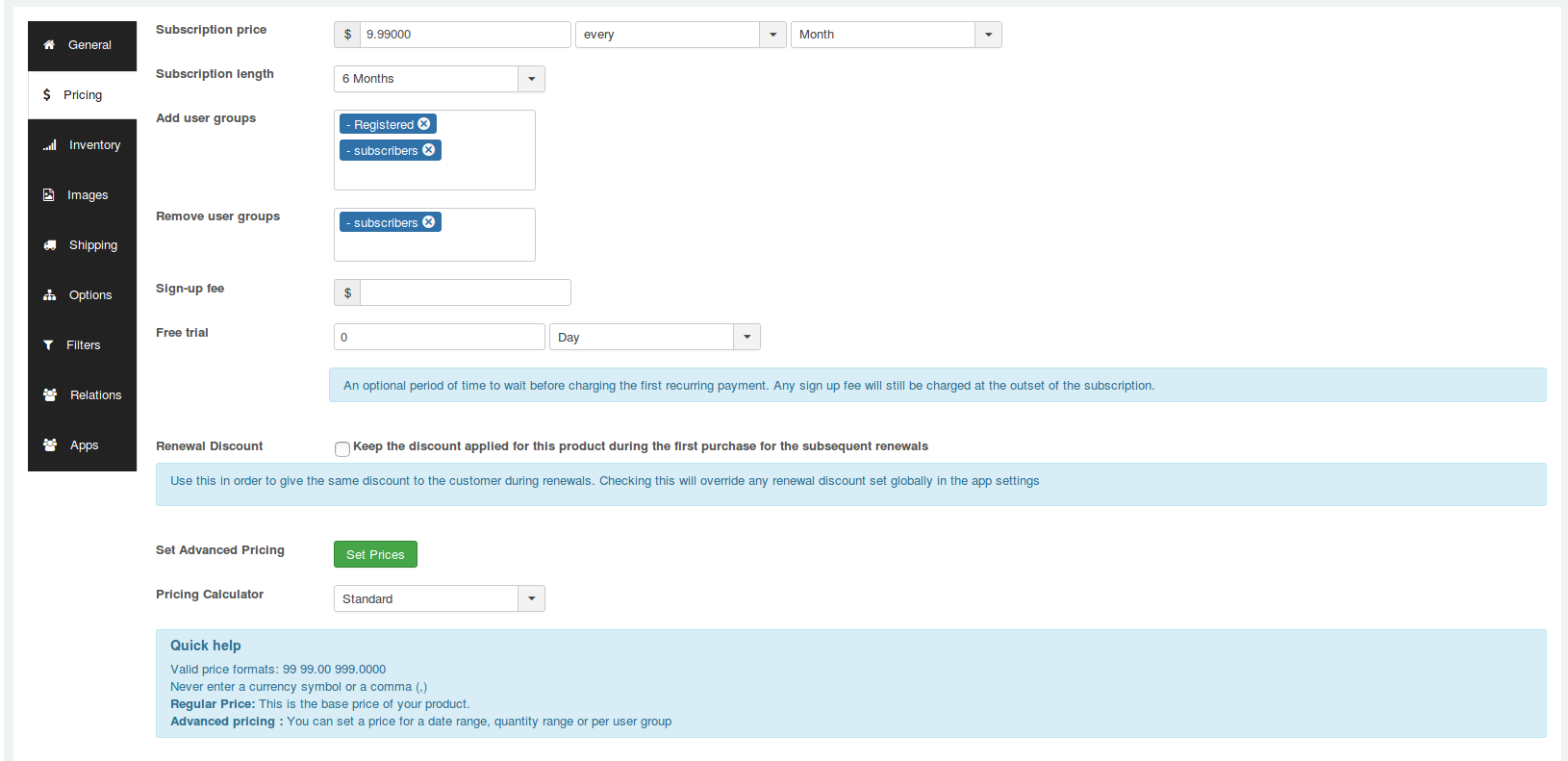Pricing tab, where you could set your subscription product’s price, customer group, expiry date, etc.