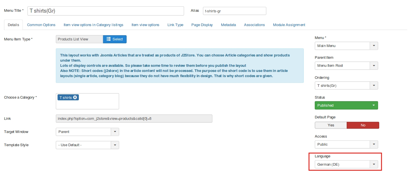 Create a product article and menu(For example:T shirts(Gr)).Choose the language as German in the content tab of the article and the details tab of the menu.