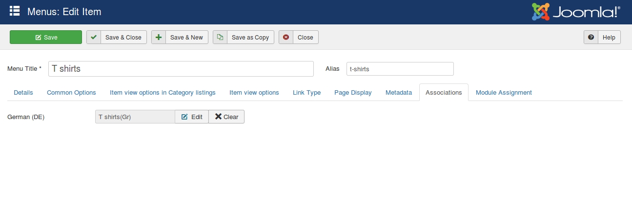 *Open the English articler’s menu and click on the associations tab. *Choose the German article’s menu and click on Save.